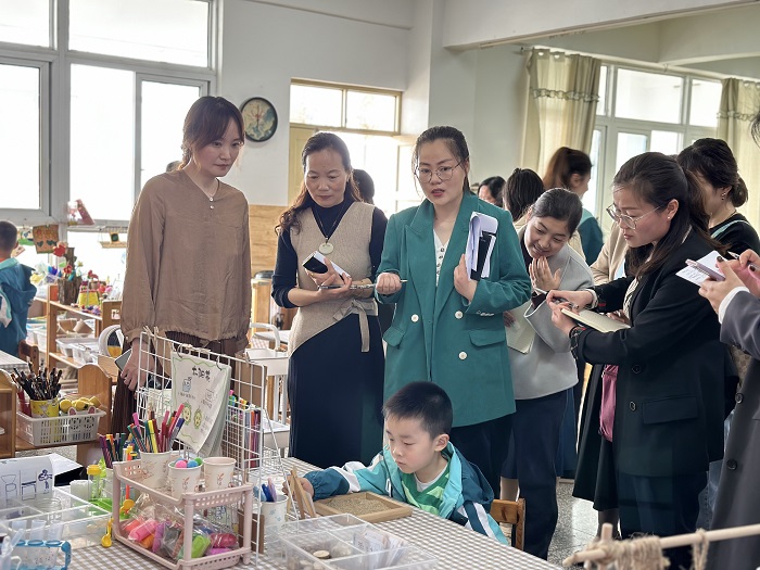 走进现场,边议边研。首先,徐丽娜主任、黄金豆园长及共同体成员围绕着材料投放、游戏状态、班级环境等方面,按照大、中、小年级组、室内外环境进行现场观摩,并针对存在的问题给出具体性的指导建议。