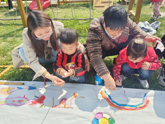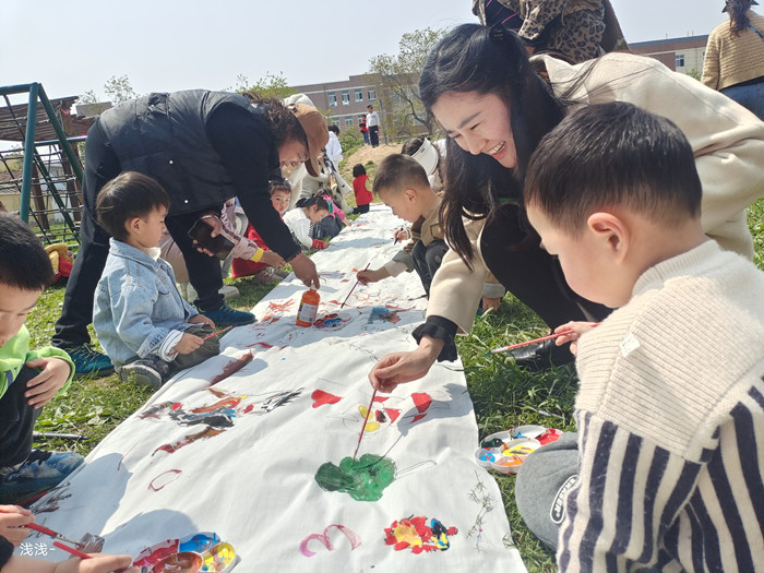 小班组开展的是亲子长卷绘画,家长及小朋友们各显身手,在长卷上尽情地涂抹挥洒,孩子们用稚嫩的画笔尽情的涂画着,活动现场一派忙碌温馨的景象,家长和孩子们一起用勾线笔、水彩颜料在画布上尽情创作,发挥各自的想象力,展示丰富的内心世界和无穷的创造能力。