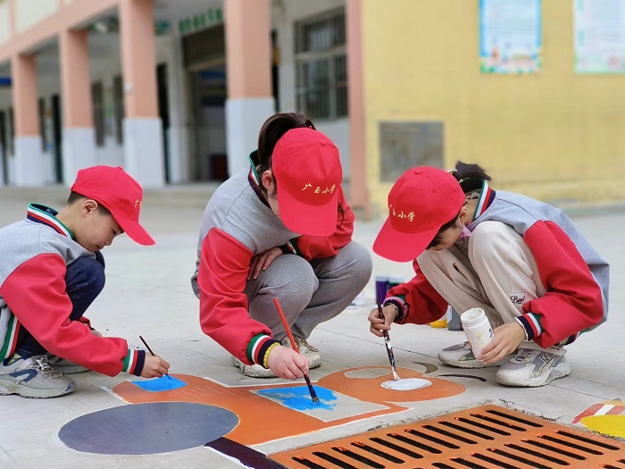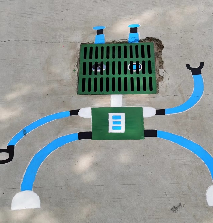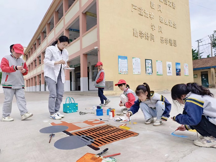 干净整洁的步行道每天都承载着学生们的欢歌笑语,但略显突兀的下水道引起了学生们的注意,5月8日的午间时分,几名学生来到办公室找老师说出了他们的想法:他们想自己动手绘制一些有创意的图画来装点步行道上的下水道,为校园增添别样的魅力。老师们非常欣喜,立即着手准备了绘图用具。5月9日,校园里就出现了一群一群的“小画家”,他们兴致盎然,手上的画笔仿佛翻飞的蝴蝶,所过之处无不染上明媚的色彩,王玉涵老师、张媛媛老师、周含老师也悉心指导,提供帮助。经过三天的共同努力,步行道上的下水道都有了自己的“身份证”,课间时分,孩子们都围聚着欣赏这些美丽的图画,整个校园充满了活力。