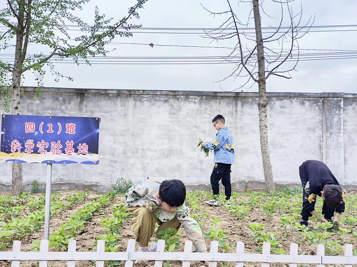 四年级的几位学生受到“小画家”们的启发,自发行动起来到自己的科学实验基地去照顾豆苗儿们。他们先把基地里的小纸屑捡拾出来,又像经验丰富、熟稔的“种植能手”一样巡视着豆苗儿们的生长情况,最后把一些杂草仔细的拔除,还豆苗儿们广阔自由的生长环境。看着他们自己种植出的生机勃勃的豆苗儿,装点出的干净美丽的校园,他们露出了自豪、满意的笑容。