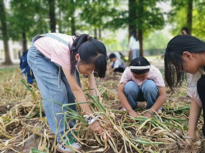 收蒜过程中,同学们有的双手合力,巧妙地拔出大蒜;有的拿起铲子,轻轻松松地挖起大蒜。老师们也不闲着,纷纷加入队伍中,挖呀挖呀挖,拔呀拔呀拔。全体师生齐心协力,誓把整个实践基地的蒜全都挖完。不一会儿,一座座蒜山拔地而起。虽然大家累得满头大汗,但是脸上都洋溢着欣喜的笑容。劳动的疲惫在这一刻都消失殆尽,剩下的只有丰收的喜悦。