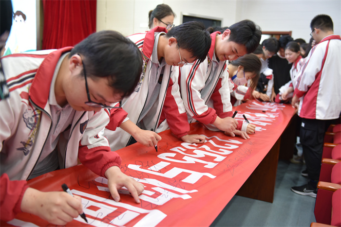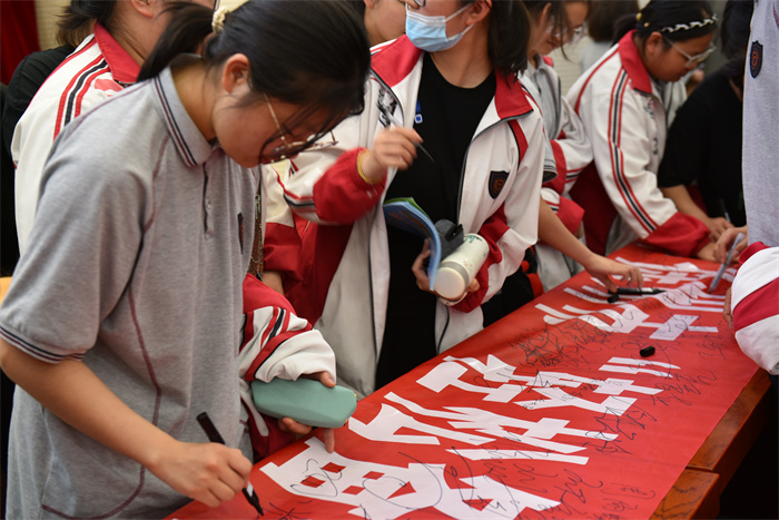 活动最后,同学们纷纷走上前来在横幅上进行签名,并写下心仪目标和自我鼓励话语。