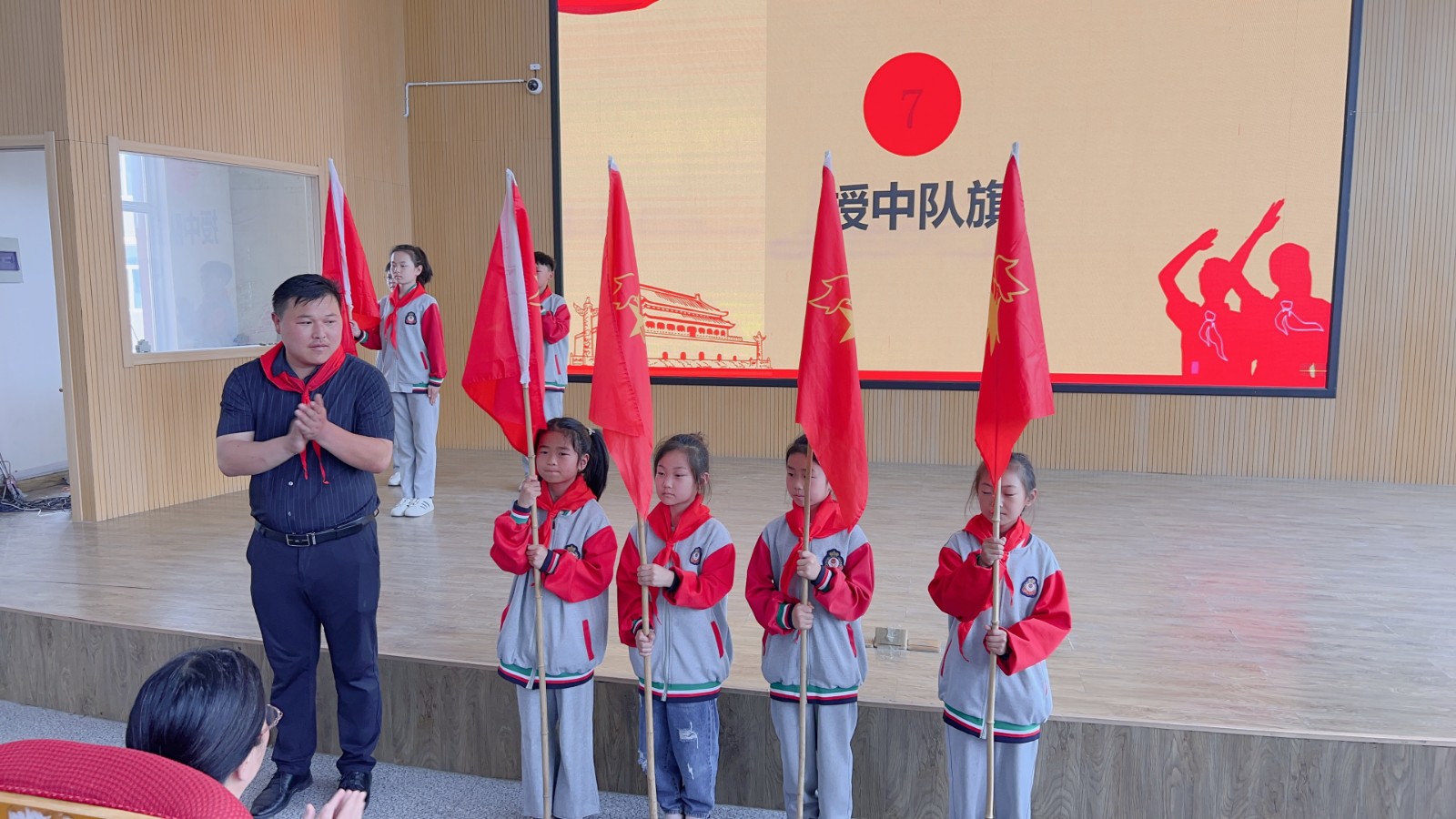 入队前,一年级五名中队辅导员在班级中进行队前教育。入队仪式按照出旗、唱队歌、宣布新队员名单、授红领巾、宣誓、授中队旗、聘请中队辅导员、党史学习教育、中队辅导员宣读《红领巾欢迎你——致新队员的一封信》、校长发言、呼号、退旗的程序进行。入队仪式中,胡兵校长发表讲话,愿少先队员们在星星火炬旗帜的指引下茁壮成长!希望大家都来争当:热爱祖国、理想远大的好少年,争当勤奋学习、追求上进的好少年,争当品德优良、团结友爱的好少年,争当体魄强健、活泼开朗的好少年。