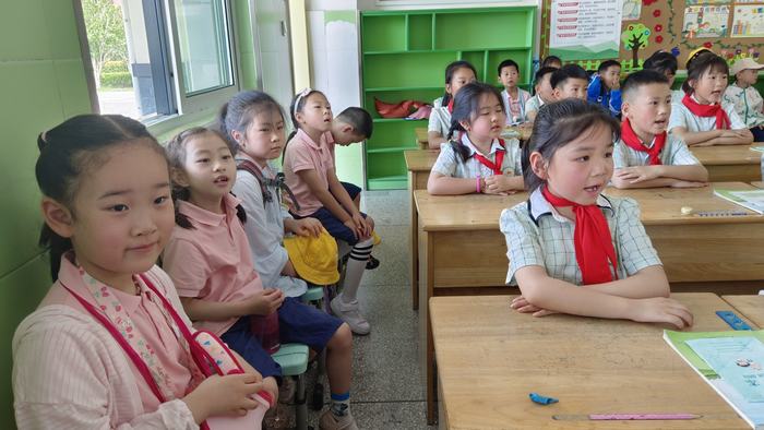 为了迎接这群可爱的弟弟妹妹们的到来,一年级的学生早已将一排排板凳整齐地摆放在教室里。大班的孩子们一个接一个地进入班级有序入座。9:10,大班的孩子们开启了属于他们的小学生课堂的体验之旅。在这节课上,大班的孩子们了解到了小学课堂与幼儿园的不同:小学会按照课程表上课,会有课间休息的时间……同时,一年级的孩子们向这群弟弟妹妹们介绍了他们上了小学后,掌握的技能:认识了很多汉字、会背诵许多首古诗、还成为了朗读高手……听了一年级哥哥姐姐们的介绍,这群大班孩子们对自己即将到来的小学生活充满了向往与憧憬。