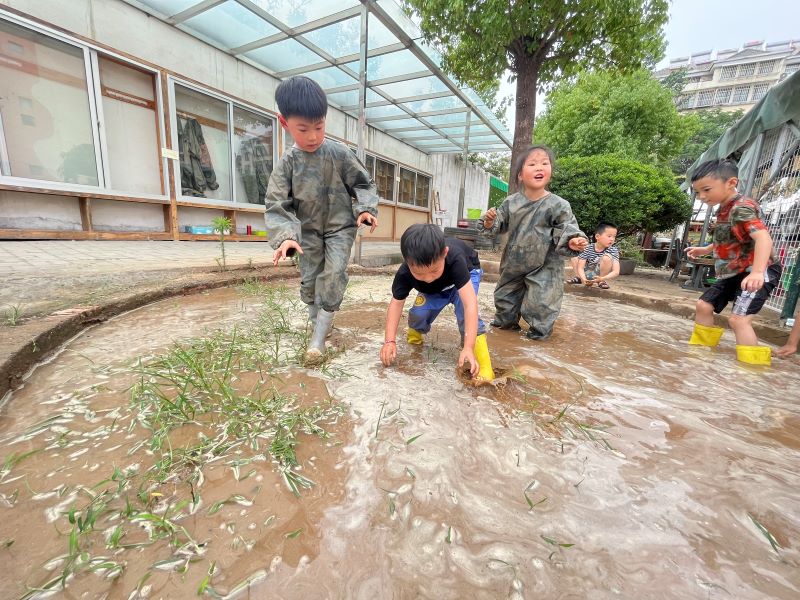 幼儿园根据孩子们的兴趣设置了捉泥鳅、掷泥球、挖泥寻宝、泥塑、跳泥坑等活动。在泥池里,孩子们穿上靴子罩衣,提着小桶弓着腰,专心致志地寻找着······“在这里!快抓住!”孩子们迅速把手伸进泥巴里,一条条灵活机敏的泥鳅从他们的指缝中溜走,孩子们既遗憾又兴奋,摩拳擦掌继续寻找。痛痛快快地在泥坑里跳来跳去是每个孩子童年的愿望,为了帮助孩子们实现这一小小的心愿,老师把轮胎变成泥坑,孩子们光着小脚快活地在泥坑中蹦跳,脚下泥花四溅,脸上绽放着快乐地笑容······