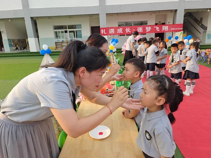 活动开始前,大班老师们认真做好毕业活动策划方案,准备材料,布置温馨的活动现场。伴随着音乐响起,毕业典礼正式开始。孩子们在毕业签名墙上认真的写上自己的名字,脸上洋溢着毕业的喜悦之情。孩子们手牵手走过启智门,老师们为孩子们进行盥洗礼、朱砂启智、颁发毕业证书等仪式,接下来孩子们点亮梦想——挂梦想卡、拜谢师恩——幼儿向班级老师鞠躬,表达教育之恩,鞠躬后拥抱班级老师,说说心里话。在所有仪式结束后,孩子们开始狂欢派对,享受美食。