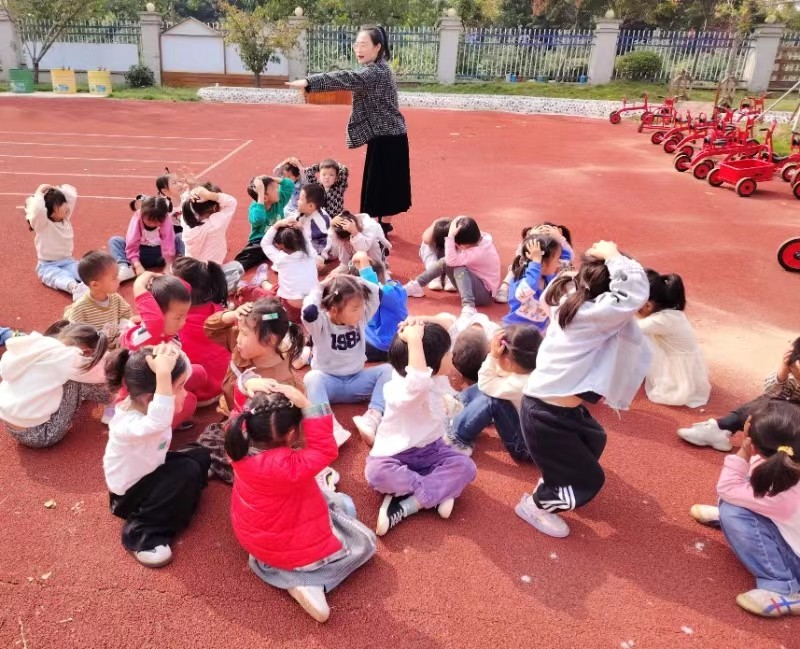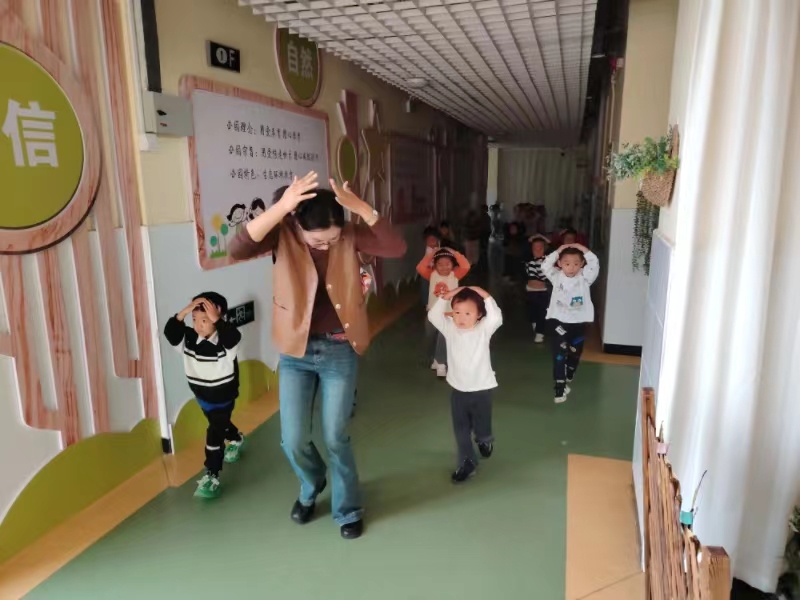 随着第一声警报声响起,防震演练正式拉开序幕。教师迅速带领幼儿双手抱头,以最快的速度躲避到墙角、桌子底下等相对安全的区域。第二次警报声响起,各班教师立即组织幼儿用手抱头弯腰低身,沿着预定路线快速有序撤离到安全地带,班主任快速清点幼儿人数并汇报。演练结束后,徐季主任就本次演练取得成效给予肯定,强调“安全重于泰山”,确保地震来临时有条不紊,保障全体师幼生命安全。
