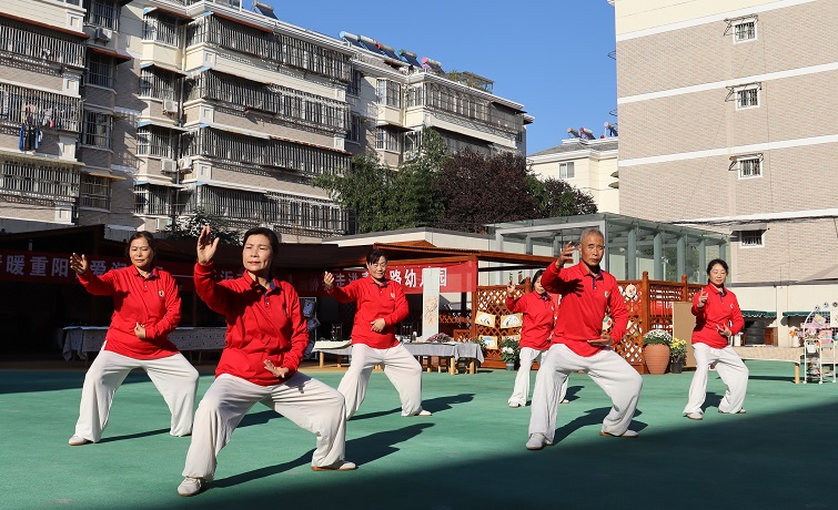 活动在非物质文化遗产“舞龙”表演中拉开了序幕,老人们手中挥动着“彩龙”上下翻飞,精彩的表演吸引着孩子们,孩子们边鼓掌边发出阵阵赞叹声。混元太极研究会的老人们在幼儿园的受邀下展示出他们的风采,老人们个个精神饱满。他们身着传统服装,在柔和的背景音乐中舒展身体,整齐划一地缓缓起势,把太极拳中正平稳、均匀柔和的特点展现得淋漓尽致,引得孩子们像模像样地模仿着老人们地一招一式。