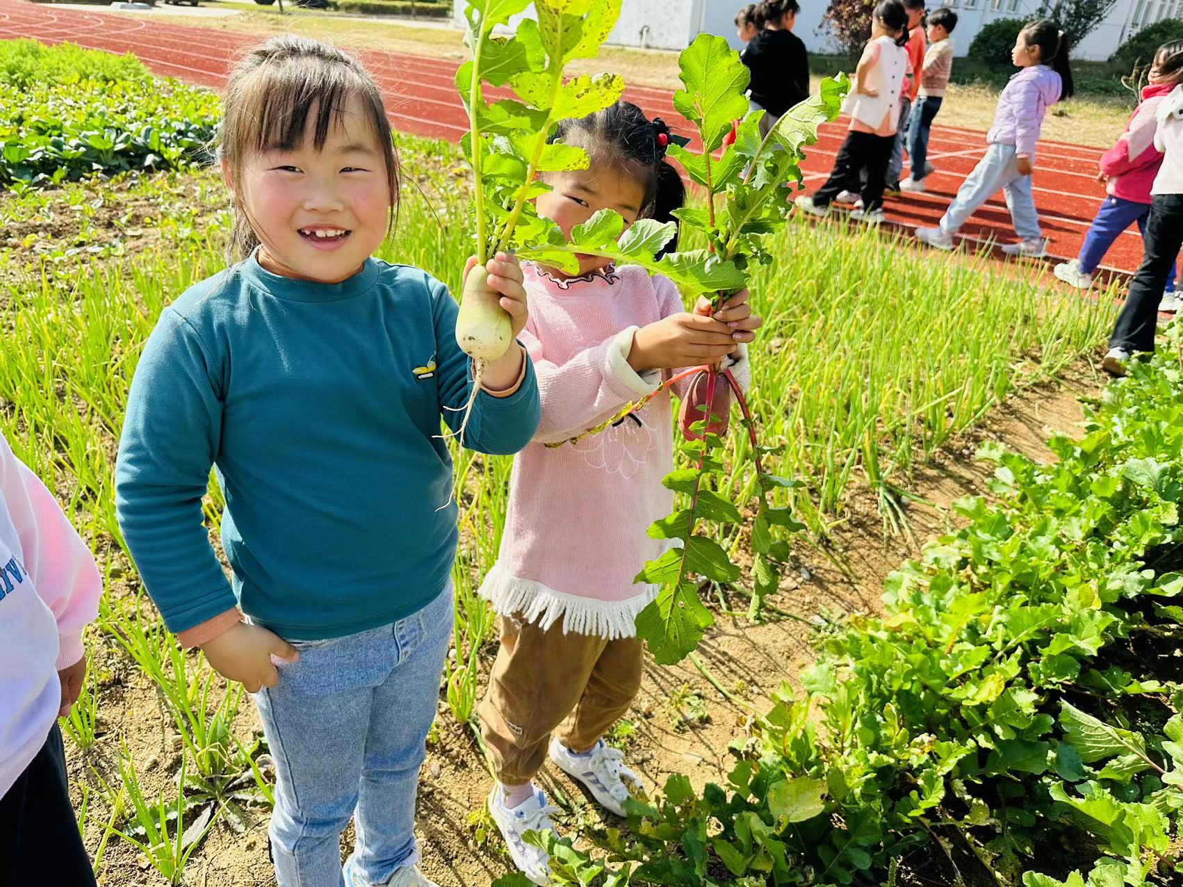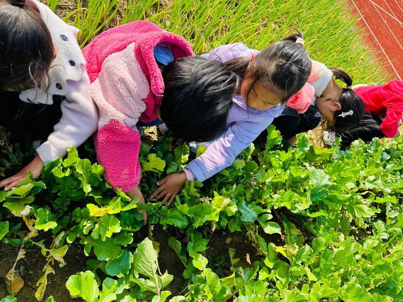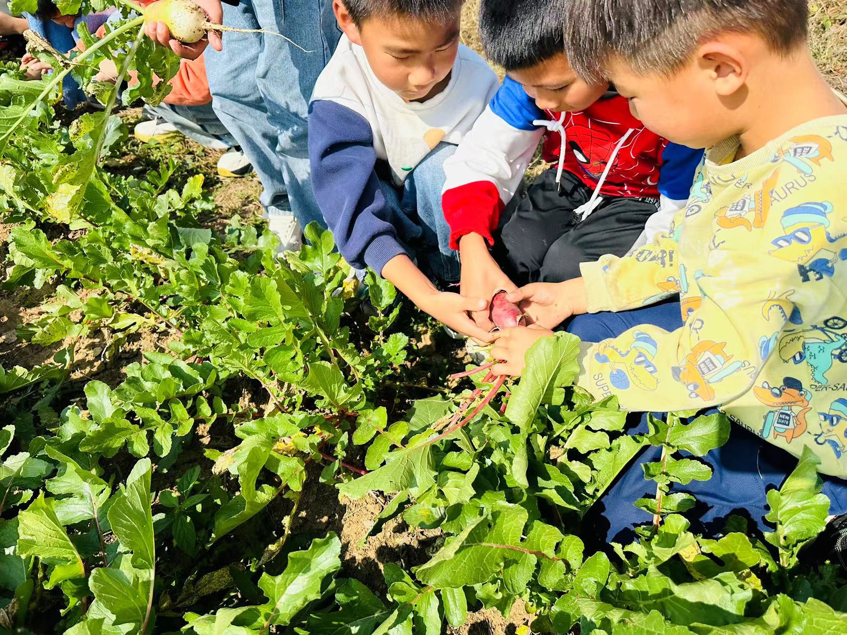 孩子们穿梭在萝卜地中,有的负责拔萝卜,有的负责泥土清理,忙得不亦乐乎。