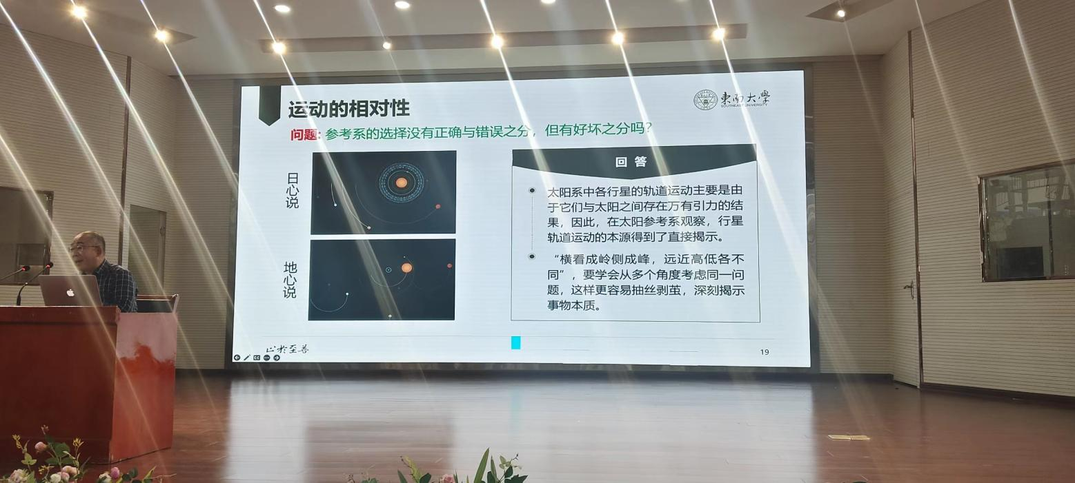 首先董教授从宋代的两首诗词中学习物体运动的相对性,如宋朝诗人陈与义的《襄邑道中》:“飞花两岸照船红,百里榆堤半日风,卧看满天云不动,不知云与我俱东”,从诗句到“日心说”和“地心说”,让同学们明白,从不同的视角观察世界,观察的结果虽然不同,但却都是正确有效的。