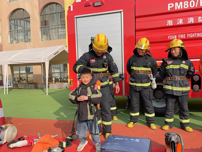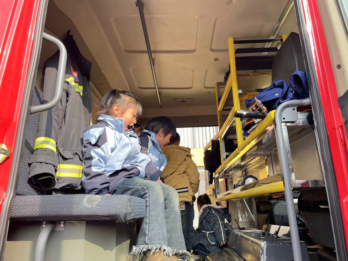 在消防员叔叔的热心帮助下,孩子们还亲身体验了烟雾呼吸器、防护服等消防器材,体验了一次“小小消防员”,同时还走进消防车内进行了参观,新奇的体验让孩子们十分兴奋。