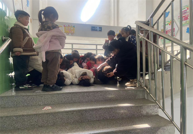 演练中,教师在保证演练的安全情况下进行,孩子们在老师的带领下,有序的上下楼梯,不挤不闹,演练过程中模仿了幼儿摔倒、自护的场景。
