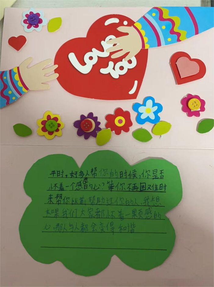 三、四年级开展了“我想对你说”活动,为父母、长辈摘抄一首感恩的小诗制作成精美的贺卡,送给他们。