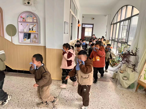 警报响起,师生立即冲出活动室,在教师带领下,全体幼儿快速反应、有序疏散,迅速集结。随后班级老师清点幼儿人数,确保全员疏散。高流消防支队队长胡耀文对疏散演练作总结并给予高度评价。