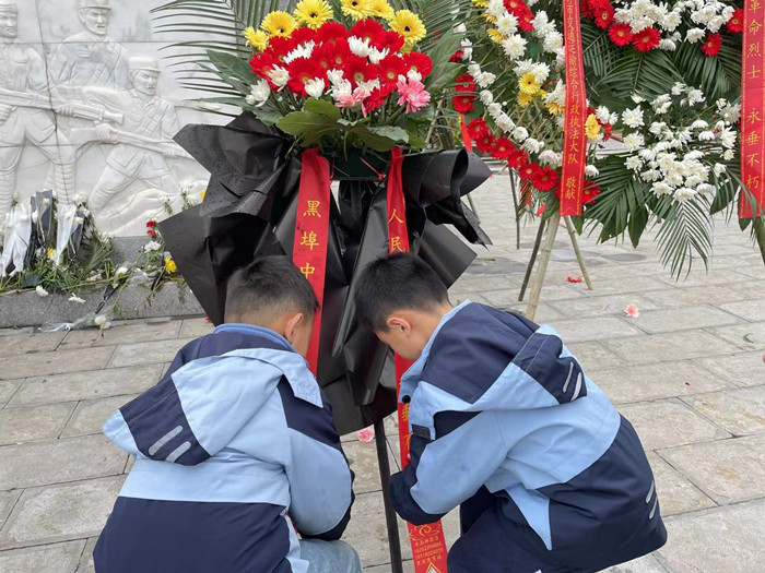孩子们在烈士纪念塔前深深鞠躬表达悼念,随后献上花圈并整理挽联寄托哀思,讲解员口中代代相传的小窑头烈士们的骁勇无畏、拼搏抗争的故事也让孩子们肃然起敬。祭扫仪式中,他们庄严肃静,纷纷手执百花,献予敬爱的先烈,慰告英雄的忠魂。