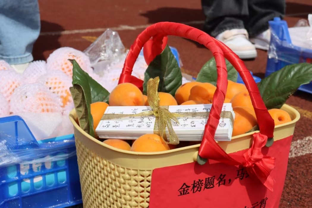 掬一捧枇杷,赠一片情谊。一篮篮的枇杷,是学弟学妹们对即将踏上人生新征程的高三学长学姐们最诚挚的祝福。高三学生代表手中端起金灿灿的“胜利果”,转眼又与“杏”运撞了满怀,一张张精美的心愿卡片携着诚挚的祝福也紧握手中。在高考倒计时的最后一段时光里,这些“金果实”无疑是对高三学子最好的祝福。