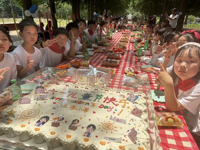 “童你分享好‘食’光”。为了给孩子们留下一个难忘的童年回忆,全体师生协同家长组织了一场美食活动。孩子们在老师和家长的带领下有序参加美食制作,通过大家的努力,一道道荤素搭配、中西融合的菜肴整齐摆放,搭配精美的餐桌布和餐具,真是一场盛宴。孩子们吃着,笑着,聊着,其乐融融,欢声笑语洒满校园的每一个角落。这个活动让孩子们感受到劳动的乐趣,也增进了师生间、家校间、同学间的情感。