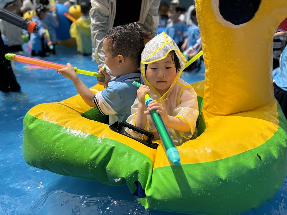 夏天玩水是孩子们的最爱,孩子们纷纷冲进水池,开始了他们的捉泥鳅、鱼之旅。他们或弯腰摸索,或追逐嬉戏,欢笑声、惊呼声此起彼伏,充满了童真与欢乐。随着主持人一声令下,一个个小黄鸭、汽艇、小船在孩子们的身边快速传递,现场水花四射,欢呼声不断,整个操场变成了五彩缤纷的欢乐海洋。 孩子们带上自己的超级装备,个个都是小英雄,纷纷展示着水枪的威力。孩子们分为两队,水枪声、欢呼声、呐喊声,此起彼伏,激情四射的水枪大战让孩子们嗨翻了天!