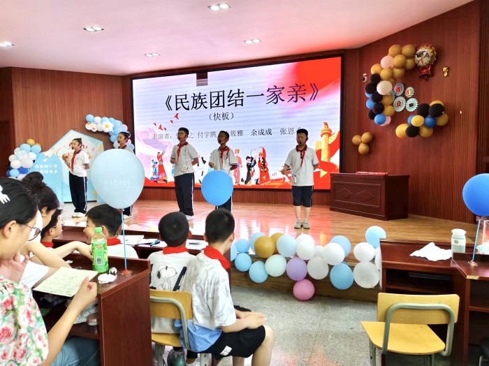 举办文艺汇演。在文艺汇演中,学生编排的《民族团结一家亲》快板节目慷慨激昂,振奋人心,在排练过程中,到站在舞台上表演,学生在亲身实践中体会并明白了团结的力量,有了群众的小团结,才有民族的大团结。