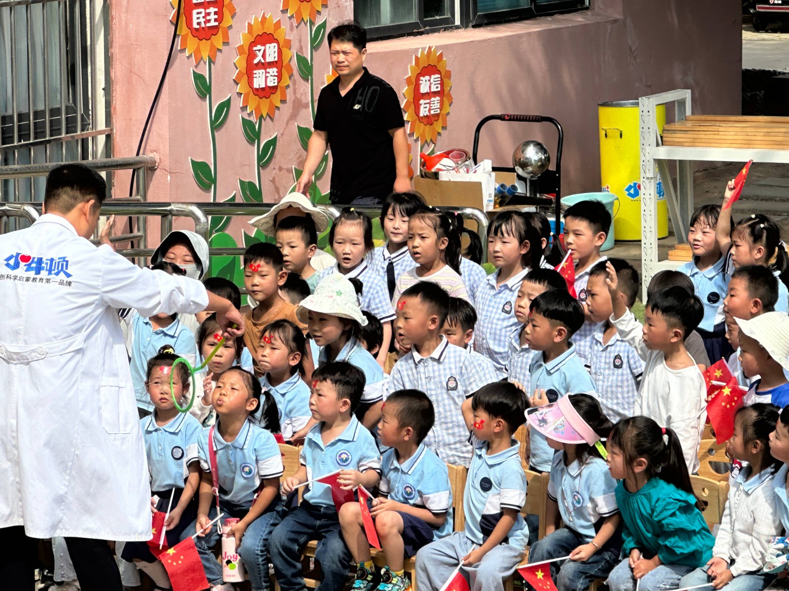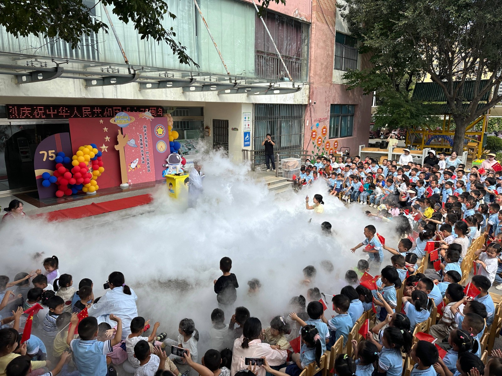 9月27日,在国庆佳节来临之际,新沂市北沟第一幼儿园举办了“童心向祖国 科技梦起航”主题科技节活动。本次活动,通过视频连线的方式,与新疆伊犁市霍城县兰干镇中心幼儿园拜什克兰木分园的孩子们一起分享科技的魅力,共同庆祝国庆节,促进了两地幼儿的交流与合作。