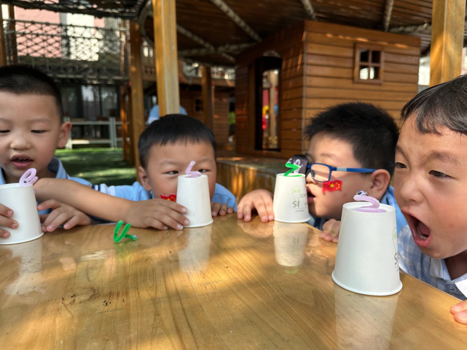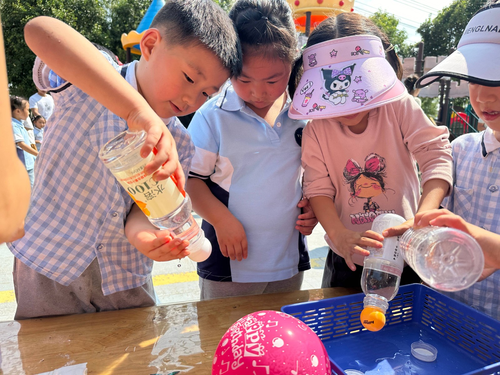 科技节当天,该园邀请新沂市“小牛顿”科学教育培训中心老师们为孩子们带来科学展演,如液氮实验、神奇泡泡等。大班幼儿精心准备了许多有趣的科学小实验摊位,如“转动的小蛇”“会跳舞的盐”“彩虹桥”等。每个摊位都配备了实验所需的材料和工具。