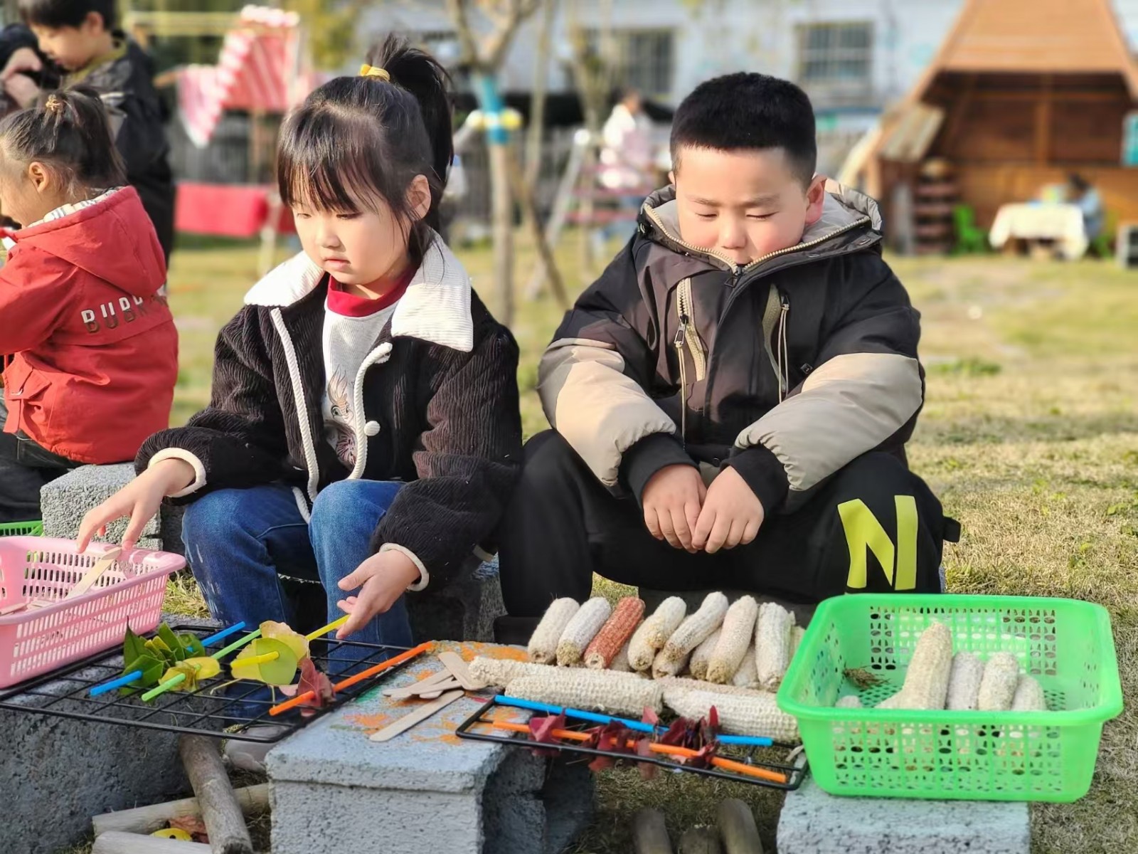 “我找到了掉落的树叶还有树枝,我要把它做成肉串!” “有好多的小石头,我喜欢喝珍珠奶茶……”孩子们利用自己寻找到的自然材料,自己动手“生火”烧烤,小手虽然稚嫩,但做起事来一点也不含糊。孩子们围坐在餐桌旁,边吃边聊,仿佛在进行一场温馨的家庭聚会。