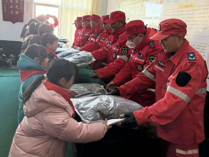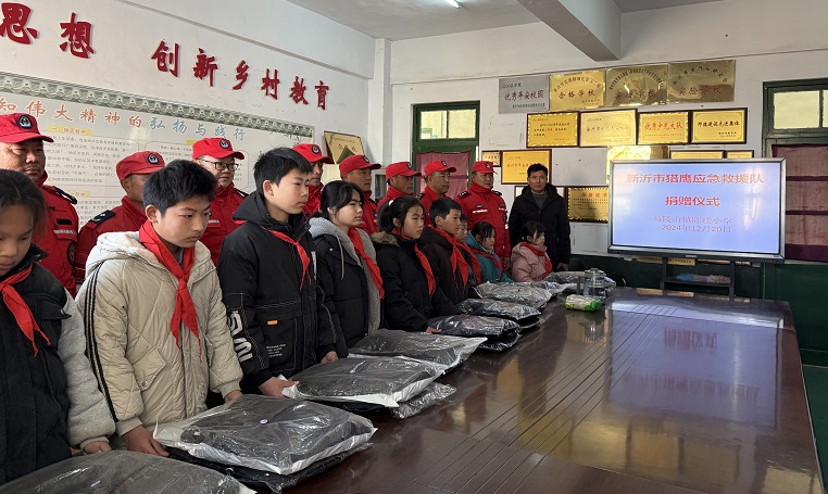 新沂猎鹰应急救援队领导向张自根校长介绍“猎鹰应急救援队”的基本情况和这次来校的目的,张校长向救援队介绍了受捐赠学生基本情况。接着,救援队员们向学生捐赠棉服和书包。他们希望,同学们志存高远,心怀感恩,勤奋学习,努力成长为祖国的栋梁之才,将来用自己的聪明才智回报社会。现场的同学们也纷纷表示,一定好好学习,决不辜负救援队叔叔们的殷切希望。