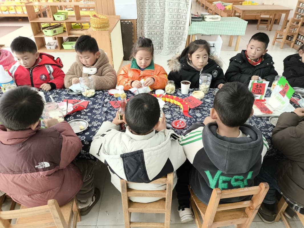 孩子们通过图片、视频、儿歌等形式了解了腊八节的由来、风俗习惯、饮食文化,感受到中国传统文化的魅力。制作腊八蒜,孩子们小心翼翼地、认真与专注地剥着大蒜。随后将大蒜放入一个可密封的玻璃罐,加入适量盐、白糖,将醋倒入容器中,让它们沉浸在这美妙的液体中,最后加盖密封,亦像是将宝藏珍藏起来,放置在阴凉处,让时间这个魔法师施展它的魔法,让大蒜发生神奇的变化,期待开封的到来,一起品尝。