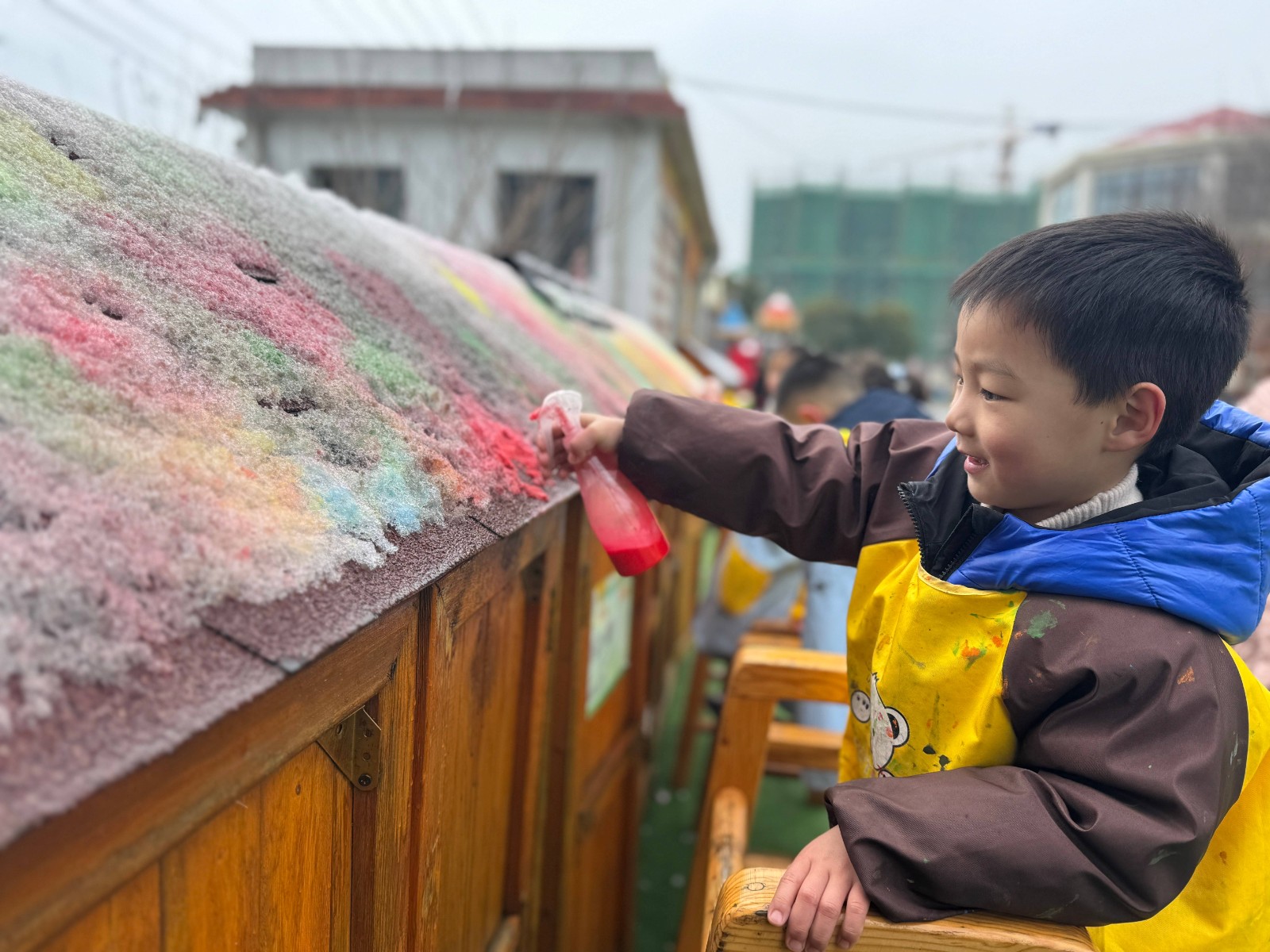 游戏区,孩子们爬上安吉梯、手持装有环保颜料的小喷壶,仰着头,发挥着自己天马行空的想象,五彩的颜料在雪面上肆意挥洒。雪地里,孩子们用画笔认真地勾勒着线条。一幅幅充满童趣的作品在他们的笔下逐渐成型……每一笔都蕴含着孩子们的奇思妙想,每一幅作品都像是一个小小的故事,等待着被发现。这场在春雪中进行的喷绘和涂鸦活动,不仅让孩子们在创作中体验到了乐趣,更让他们亲近了大自然,感受到了春天雪景的独特魅力。