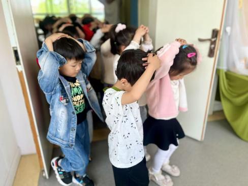 随着警报声响起,各班教师立即停止所有活动,指引幼儿就近躲避,用双臂保护好头部,迅速躲在桌下、墙角等安全三角区。接着,各班老师迅速集合幼儿有序撤离教室,按照规定的疏散路线迅速撤离到操场,并清点人数,保证所有幼儿安全撤离。