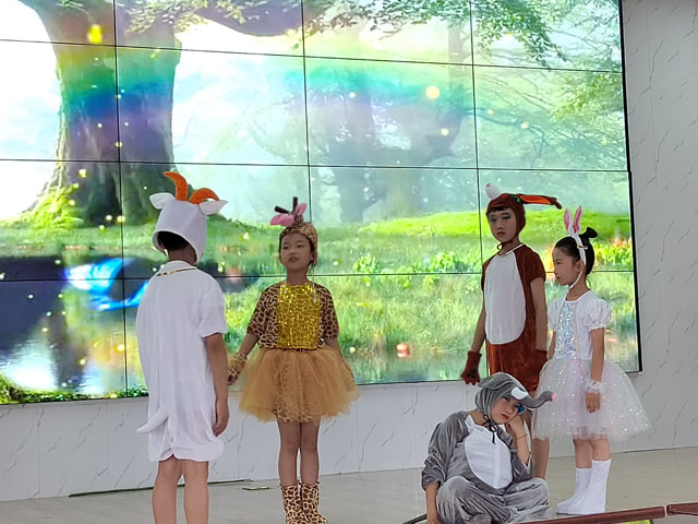活动分为筹备和展评两个阶段,全校一至五年级共51个班级参与,每班精心编排一个剧目。展演中,学生们将经典课文与创意改编相结合,通过清晰的台词、自然的表演、精美的服装道具,将《咕咚》《陶罐和铁罐》《清平乐·村居》《小英雄雨来》等经典篇目搬上舞台。低年级学生用童真童趣演绎《咕咚》《棉花姑娘》等故事,生动的表情、稚嫩的声音,将角色特点展现得淋漓尽致;中高年级学生则通过《守株待兔》《自相矛盾》《拔苗助长》等寓言,以及《清平乐·村居》《游子吟》等诗词改编剧目,以更具深度的表演,诠释传统文化的内涵。
