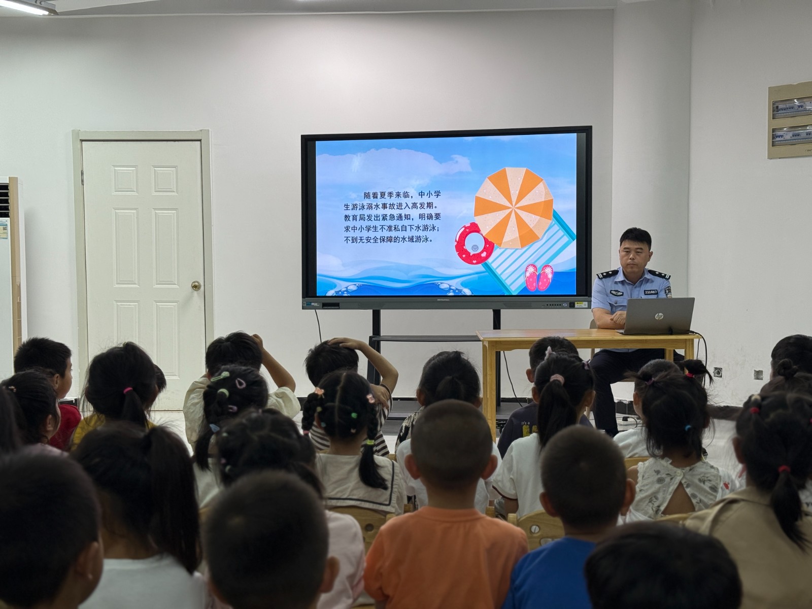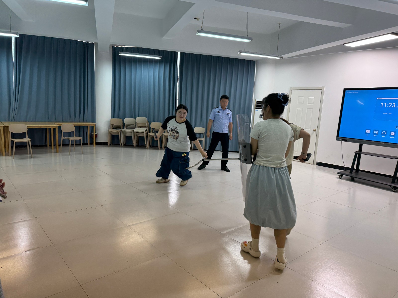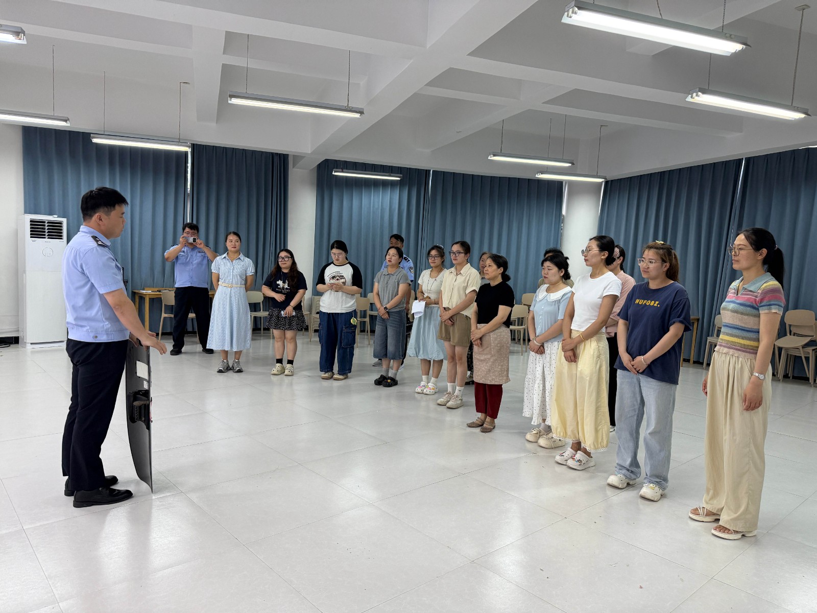 防暴演练中,民警刘江、吴尚峰示范防暴钢叉、盾牌等器材使用方法,讲解“阻挡-控制-疏散”流程,通过模拟“歹徒闯入”场景,演示用身体构筑防护墙、转移幼儿技巧,教师分组练习并获民警指导。防溺水课堂上,吴警官和民警张心婕以PPT、儿歌互动形式,讲解溺水风险与自救方法,演示救生圈使用等技巧,孩子们在游戏中牢记“六不准”口诀。