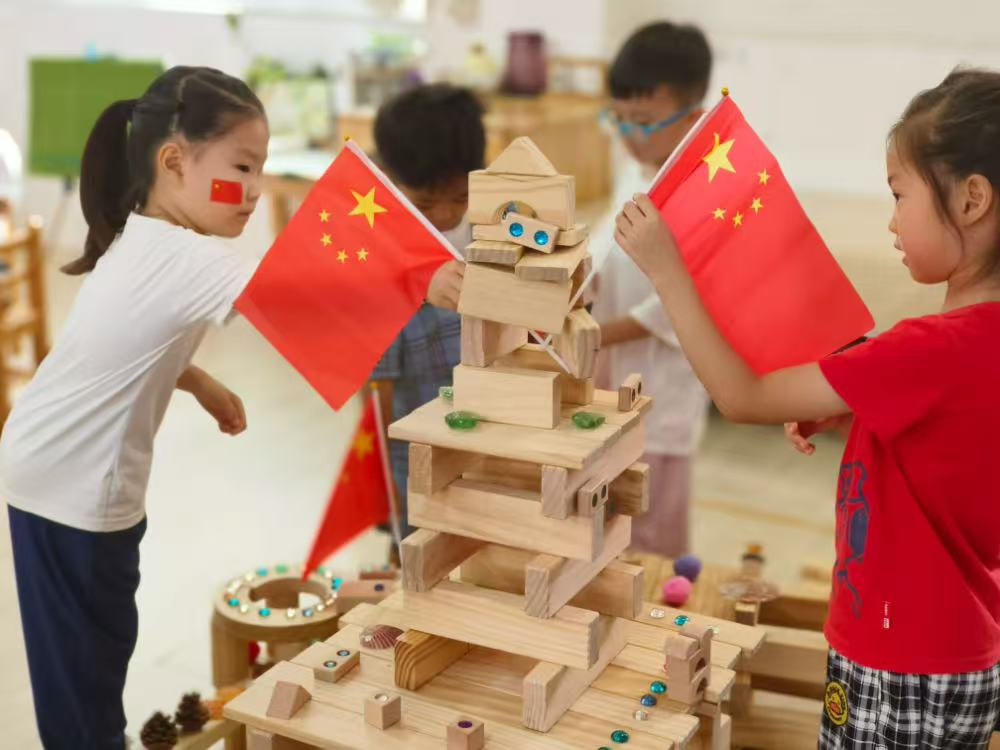 观看阅兵后,幼儿园开展了丰富的延伸活动。老师们通过讲述相关知识,以孩子们易懂的方式介绍中国人民的光荣传统。孩子们还用画笔绘制抗战画卷,化身“小小工程兵”拼插、搭建,体会团结协作与坚持不懈。此外,老师们还为孩子们准备了五星红旗,创造合影场景,孩子们手举小国旗,表达了对祖国的热爱和对军人的崇敬。