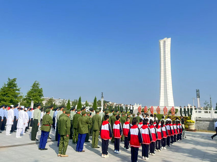 9月30日上午,淮海战役十人桥烈士陵园内庄严肃穆,各界代表、草桥镇堰头小学师生队伍与老战士、烈士亲属、退役军人及拥军模范一道,以最诚挚的姿态,向为国家独立、民族解放献身的英雄们致以崇高敬意,目光中满是对历史的尊重与缅怀。