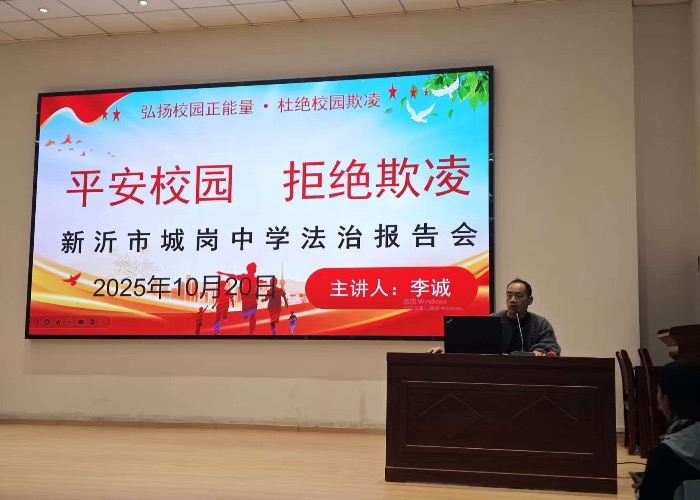为进一步增强学生的法治观念,有效预防校园欺凌事件发生,营造和谐、平安的校园环境,10月20日,市城岗中学举行“平安校园 拒绝欺凌”法治报告会。本次报告会由德育处副主任李诚主讲。