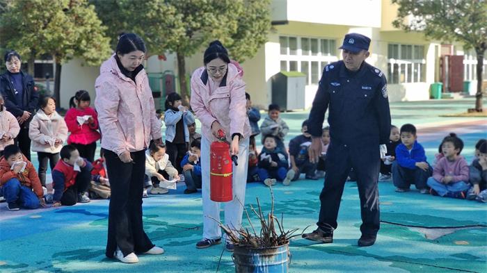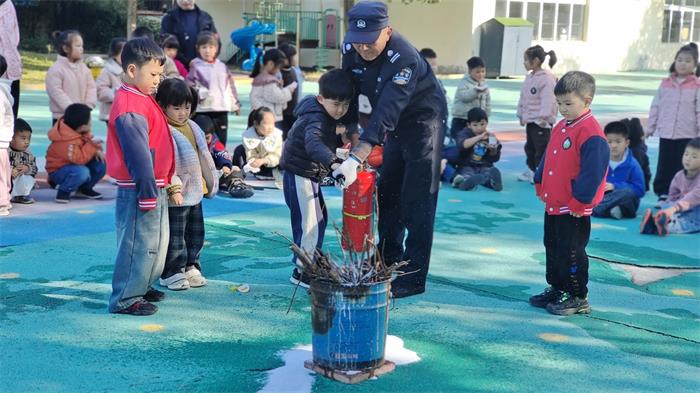 疏散演练结束后,陈芹园长对本次演练进行了总结,再次强调逃生注意事项。随后,保安现场演示灭火器“提、拔、握、压”的正确使用方法,教师和幼儿现场进行实操体验,切实掌握灭火技能。