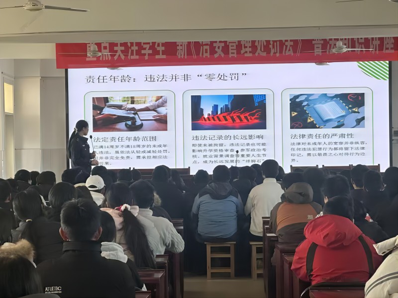 为进一步强化学生法治观念,提升反诈防骗实操能力,筑牢校园安全防护网,12月26日下午,钟吾派出所3名民警走进我校,以“知法守法,护航青春”为主题,为同学们带来了一场内容翔实、干货满满的安全知识讲座。